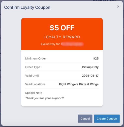 Here you can see the coupon specifics that will be sent to the customer when the coupon is created to make sure they are as you expect. If you need to make changes, simply cancel from this window and adjust as required. When you are confident in your coupon, click "Create Coupon" to send it to your customer.