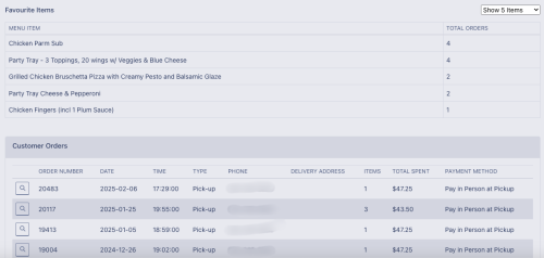 Below the summary you will find additional customer details including their top ordered items so you can better understand their preferences from your menu, as well as a full list of their orders. You can click the magnifying glass to go to the order detail for any order to review it in more detail.