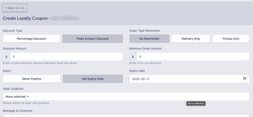 Customers love rewards and a coupon for a future order is a great way to encourage them to return! We've made it easy for you to create and send a Loyalty Coupon to your customers for this purpose. The loyalty coupon screen allows you a fair bit of flexibility on how you would like the coupon to work for your customer.