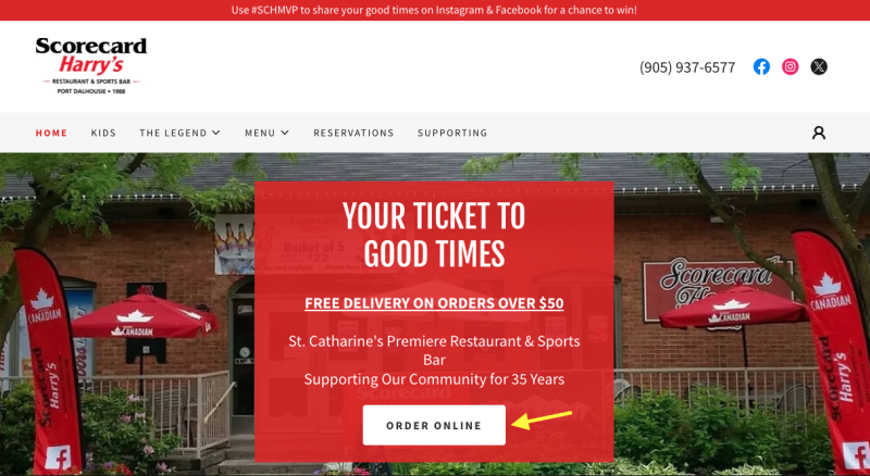 Screenshot of Scorecard Harry's home page showing where they link to order from Dine Niagara