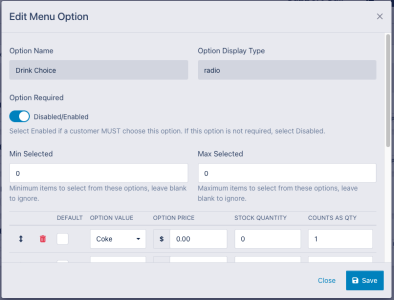 Now that you have added the options you would like to have available on the item, you can add item specific modifications to them such as the order in which they appear or minimums/maximums for selections. You can also set menu item specific pricing for these options, however we generally recommend handling those situations with a separate option set as noted previously.