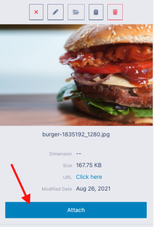 Once you have the image you would like to attach to the menu item in the system you can click on it to highlight it, then choose the "Attach" button on the right pane to select it.
