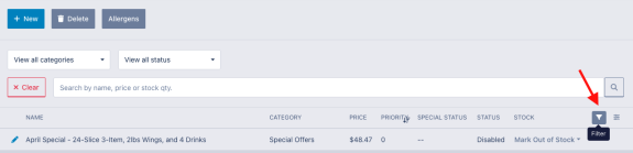 Your full menu list can sometimes be difficult to navigate unless you have a very simple menu, but you can quickly navigate and filter your menu by using the filter feature. To add filters to your menu, click the funnel icon at the top right of the list header and the system will add the ability to filter the menu by category or status, or to search the menu for a specific phrase.