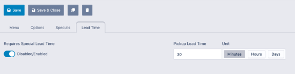 Dine Local also supports item specific lead times to allow you to handle complex items that either take longer to prepare, or which need to be ordered day(s) in advance. Click to the "Lead Time" tab for item specific lead time options.