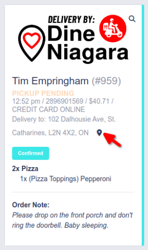 Orders that are being delivered by the Dine Local network will be clearly marked with our Delivery by Dine Local logo. Any order that has our logo indicated has already had the delivery driver requested and dispatched for you. For locations where we have enabled automatic dispatch, the delivery will automatically be set up when you confirm the order and the details will be populated into the order detail.