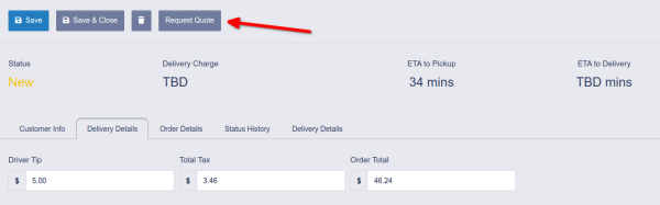 Once you have saved the basic delivery information, you will see a new status panel at the top of the page and a new button which will allow you to request a quote from the delivery providers configured for your location. Confirm that the 'ETA to Pickup' matches your expected pickup time, and tap the 'Request Quote' button to get the best delivery rate available for the customer's address.