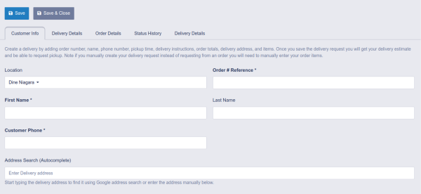 Creating a new Delivery manually isn't as simple as the automated process from a Dine Niagara order, however we have tried to make things as easy as possible.